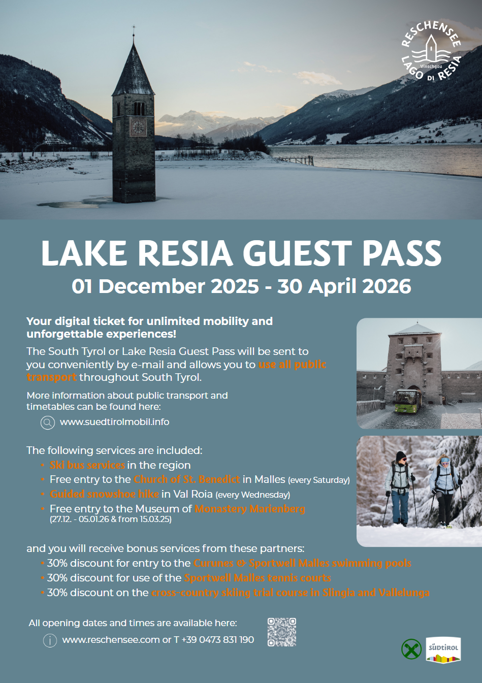 With the Lake Resia Guest Pass, you can enjoy free travel throughout South Tyrol, as well as many leisure and cultural offers.